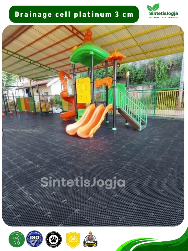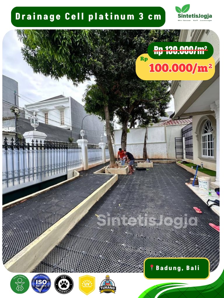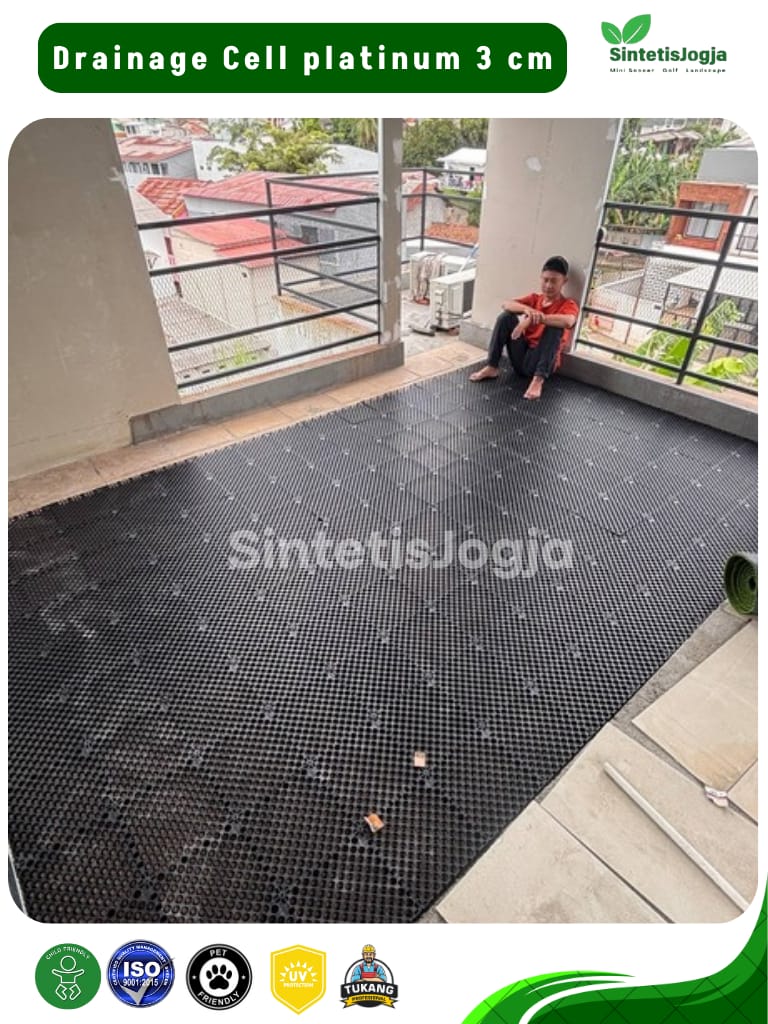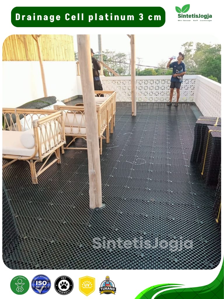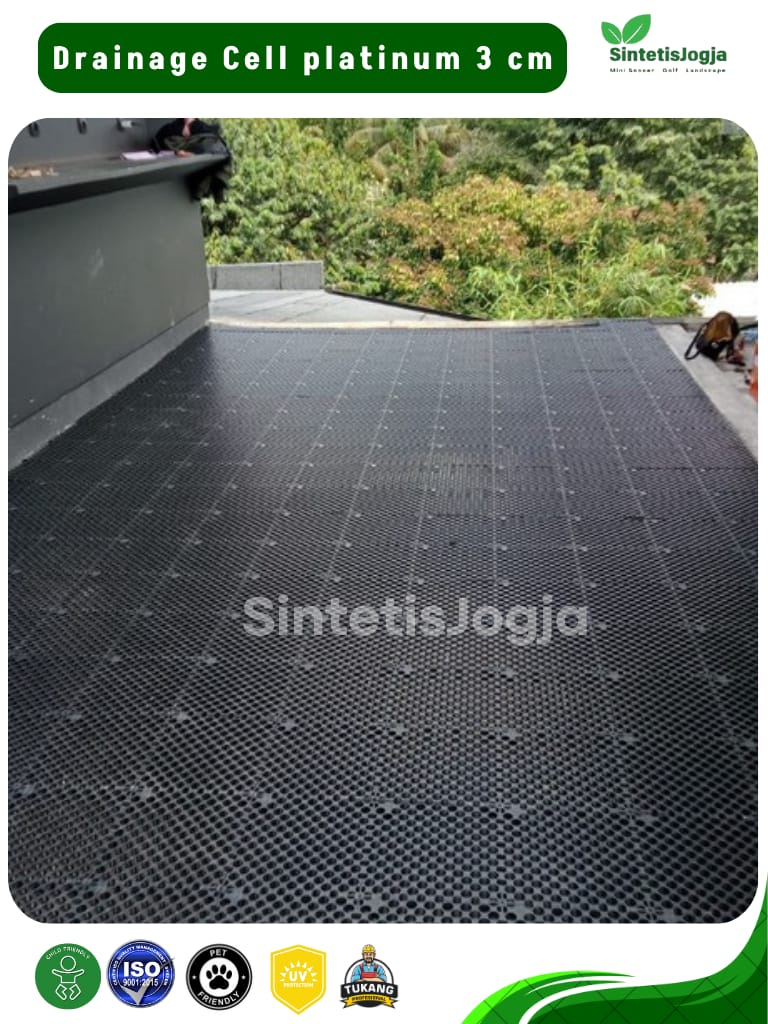 Memiliki rongga udara luas dibagian bawah untuk mengalirkan air hujan atau air sisa pencucian langsung ke saluran pembuangan. Solusi cerdas agar rumput sintetis Anda tidak terendam air saat hujan deras.