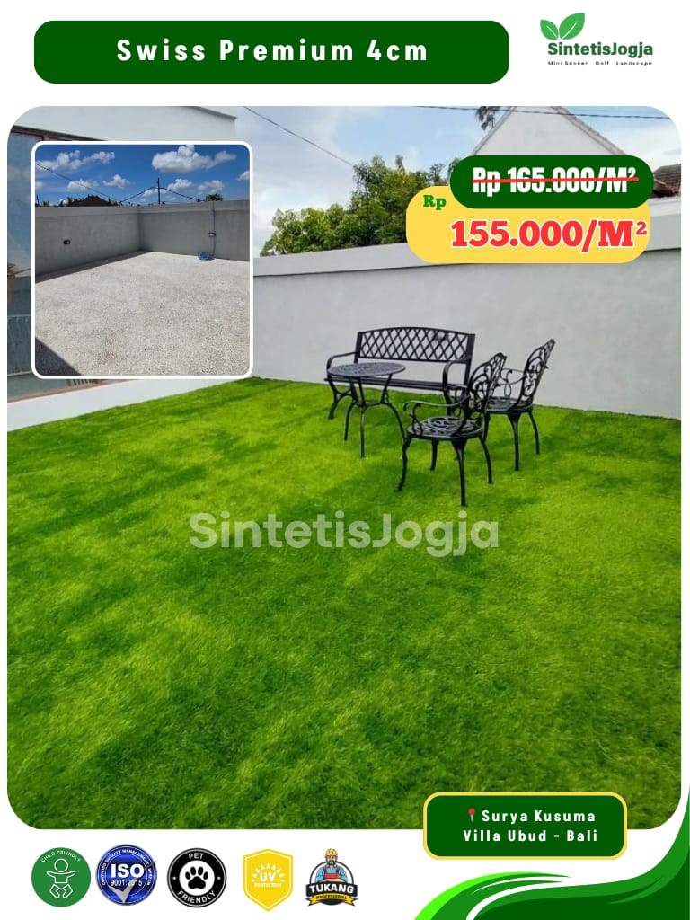 Swiss Premium hadir untuk Anda yang menginginkan rumput sintetis berkualitas tinggi dengan daya tahan ekstra namun tetap dengan harga yang kompetitif. Dengan dukungan alas 𝗗𝗼𝘂𝗯𝗹𝗲 𝗣𝗣 dan bersertifikat 𝗜𝗦𝗢, produk ini menjadi standar baru untuk kenyamanan taman rumah Anda.